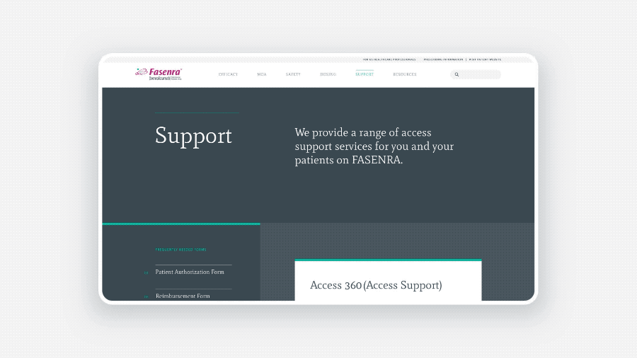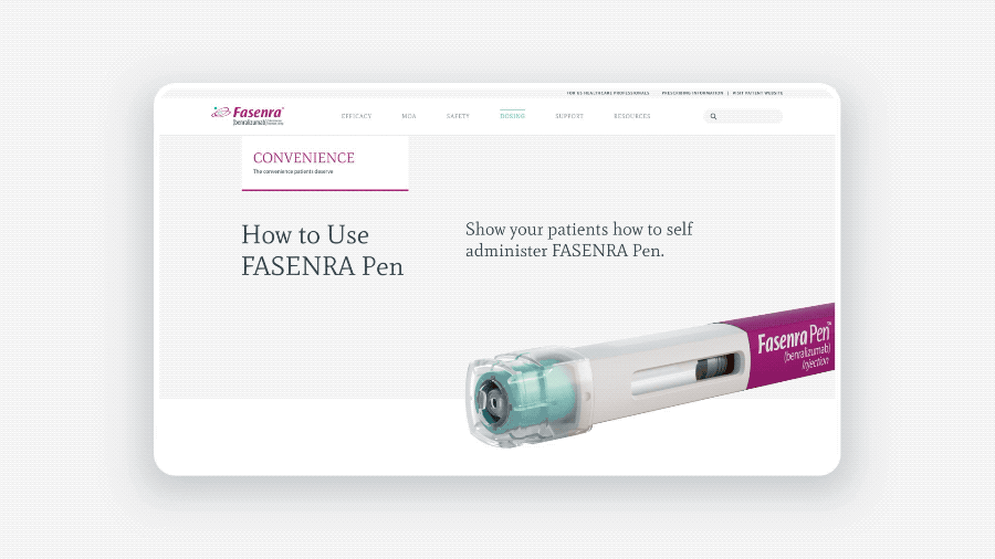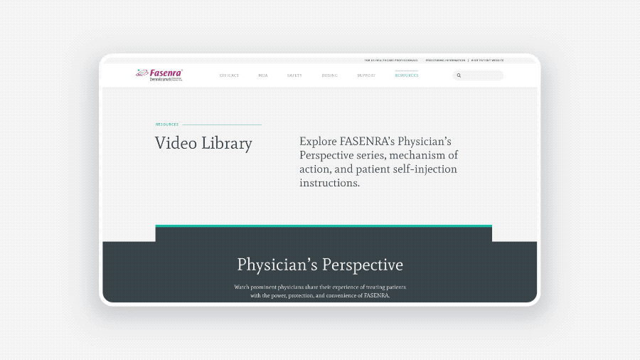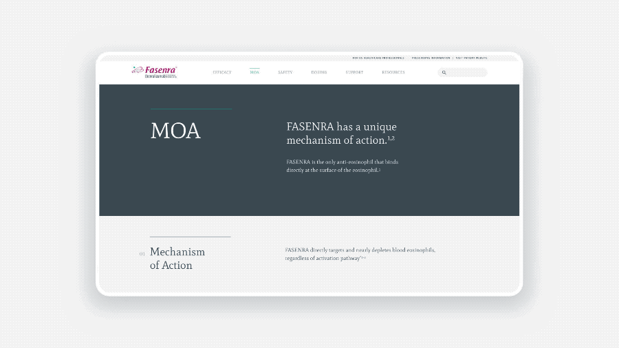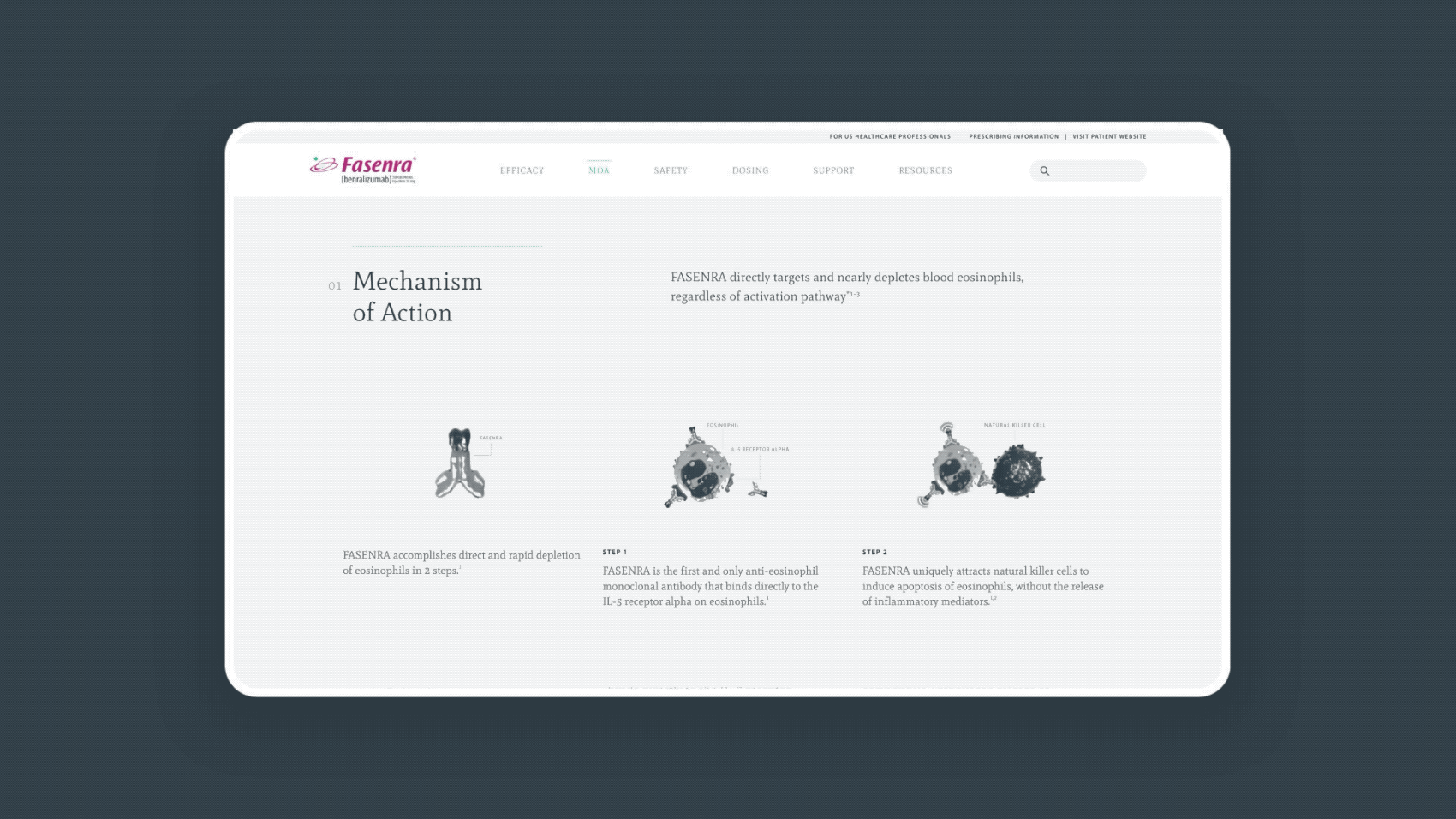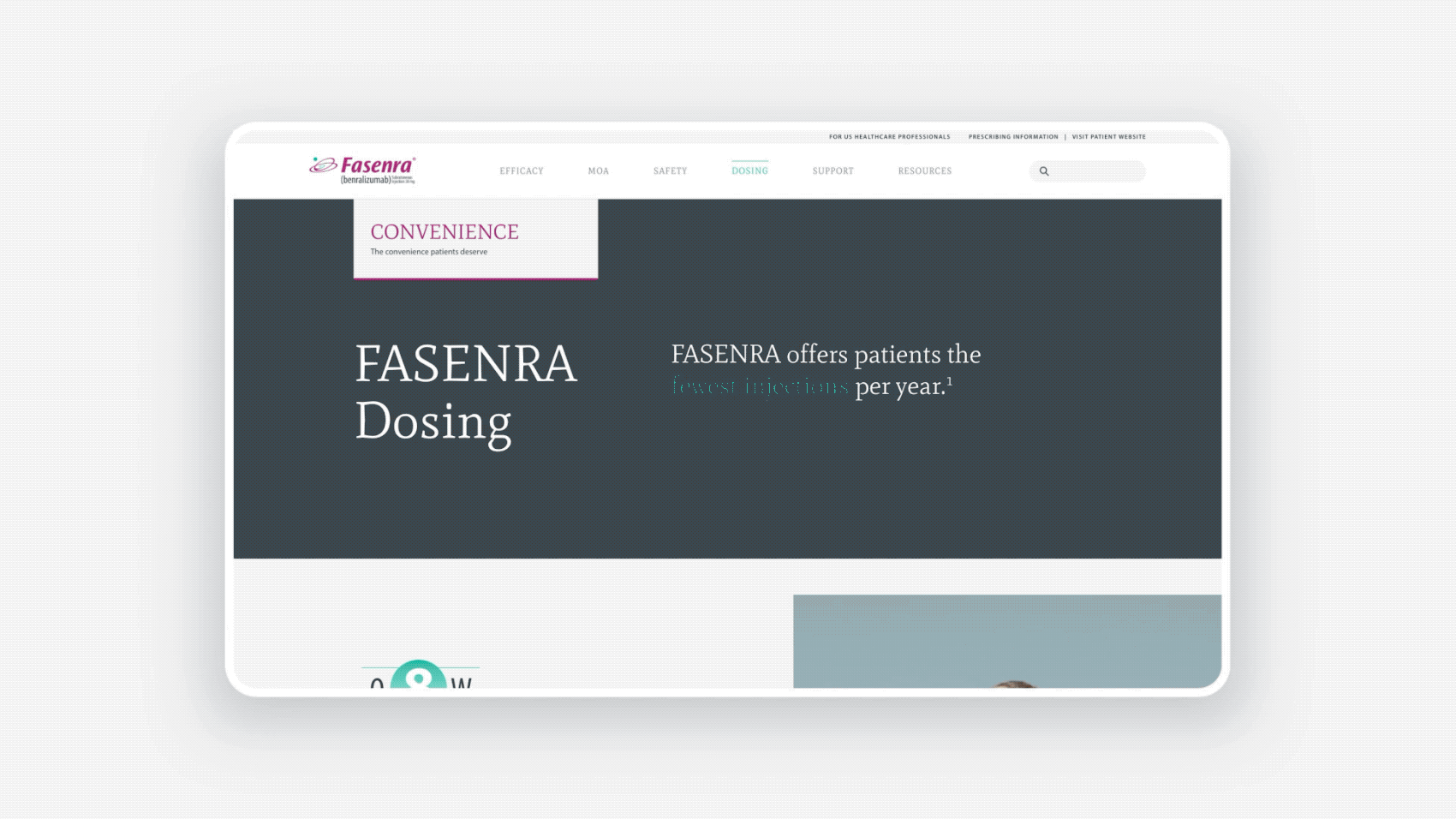Tasked with redesigning Fasenra’s website for healthcare professionals, I revitalized their brand and brought it into the twenty-first century. The design leans into the look and feel of a medical journal, something that feels familiar to an HCP that essentially meets them where they are. A strong focus on typography and simplified iconography bring a modern and elevated feel to the brand.